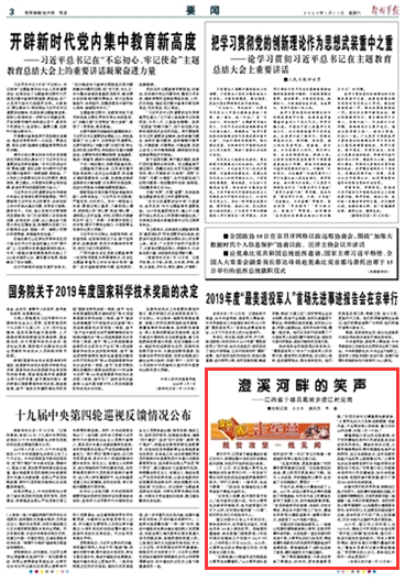 江西省于都县葛坳乡澄江村距今已有上千年的历史。革命战争年代,红军曾在此驻扎,村里先后有100多人参加红军。因地理位置偏僻、缺乏致富门路等原因,3年前村里仍有建档立卡贫困户122户595人,人均年收入不足2000元。2016年,火箭军机关定点帮扶澄江村后,村里的变化日新月异。请关注《解放军报》的报道——